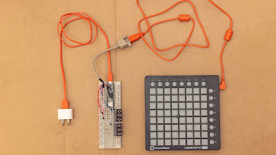A USB host cable is connected between the USB host post on the Teensy and a USB MIDI device, in this case a Launchpad Mini Mk II.