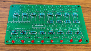 Place and solder the 8 x red 3mm LEDs. In the picture, the short negative leg is oriented towards the lower edge of the picture.